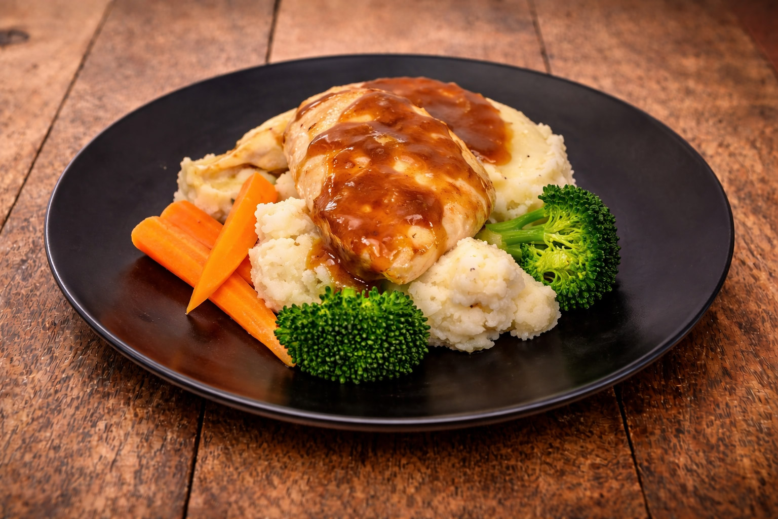 Succulent roast chicken cooked until tender and golden, served with rich, savoury gravy and a side of vibrant broccoli and sweet carrots. Simple, wholesome and full of flavour.